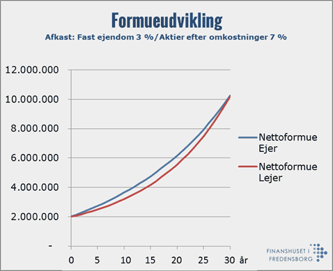 Afkast: Fast ejendom 3 %/Aktier efter omkostninger 7 %. Forskel i nettoudgifter 60.000 kr./år på leje og eje.