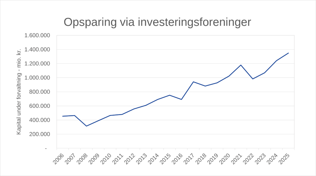 Samlet kapital under forvaltning i danske investeringsafdelinger rettet mod private investorer. Kilde: Finans Danmark i Børsen – Danskerne elsker særlig investeringsform – men skjult pris er høj