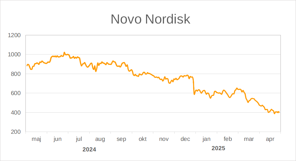 Novo Nordisk kurs, 30/4 2024-29/4 2025. Kilde: Novo Nordisk | Google Finans.