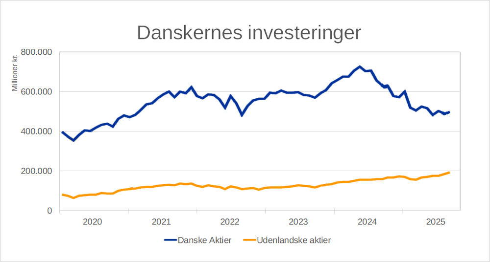 Danskernes investeringer i danske aktier og udenlandske aktier, millioner kroner, jan. 2020 – okt. 2025. Kilde: Aktienedtur rammer danskerne hårdt | Børsen