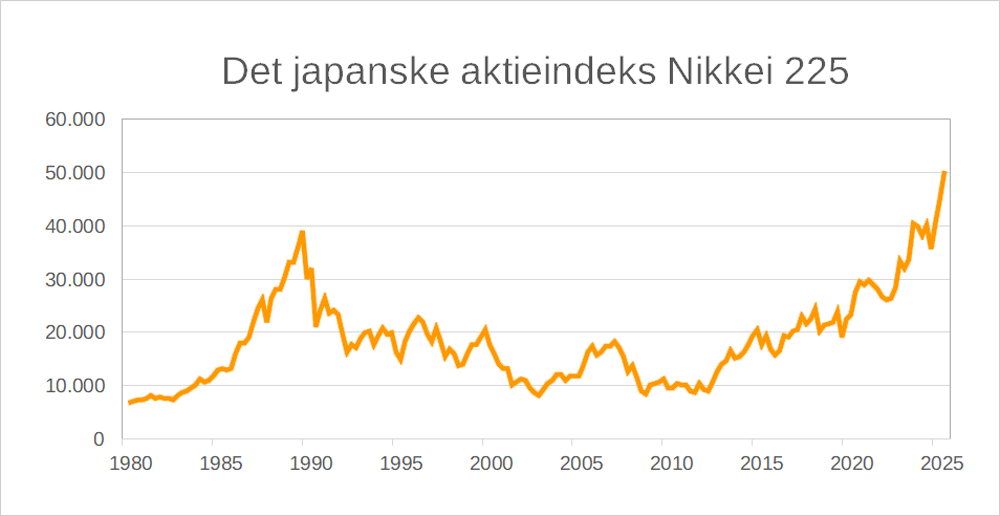 Det japanske aktieindeks Nikkei 225, 1980-2025. Kilde: Aktienedtur rammer danskerne hårdt | Børsen