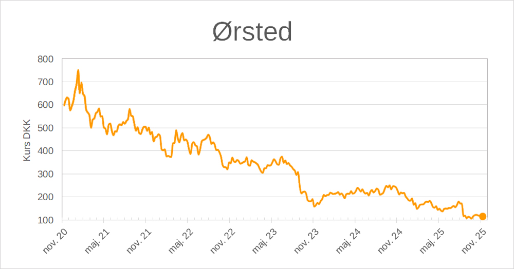 Ørsted aktiekurs DKK, 6. nov. 2020 – 5. nov. 2025. Kilde: ORSTED Ørsted | Google Finans