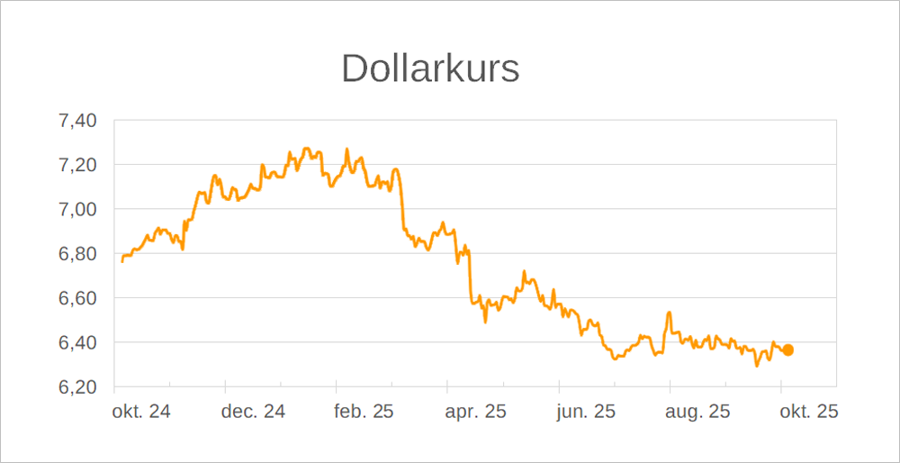 Dollarkurs til danske kroner, 3. oktober 2024 til 3. oktober 2025. Kilde: USD/DKK | Google Finans