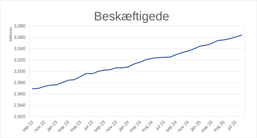 Antal lønmodtagere i erhvervene i alt, sæsonkorrigeret.