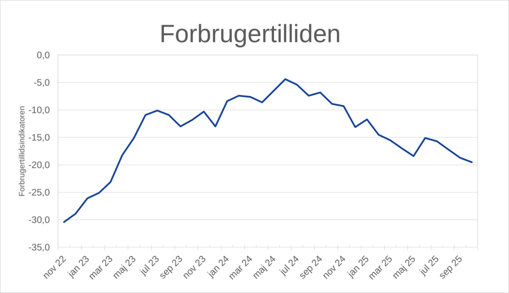 Forbrugertillidsindikatoren, nov. 2022 – okt. 2025. Forbrugernes vurdering af deres egen og Danmarks økonomiske situation i dag og om et år.