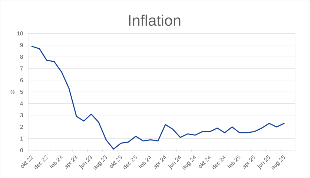 Forbrugerprisindekset i alt, nov. 2022 – okt. 2025. Ændring i forhold til samme måned året før (pct.).