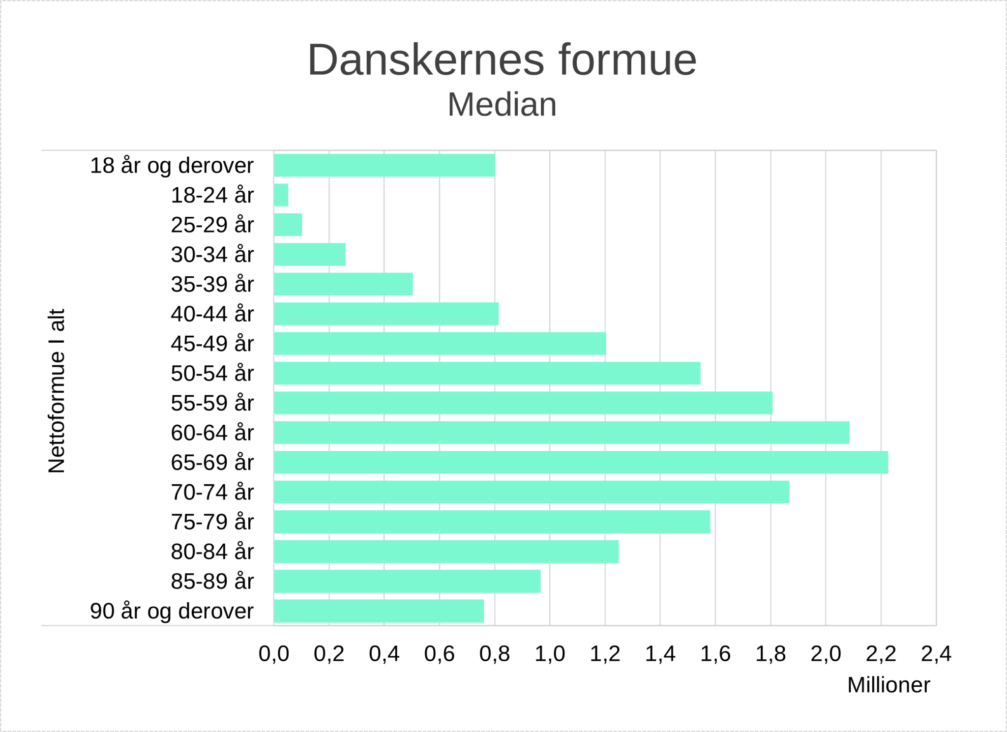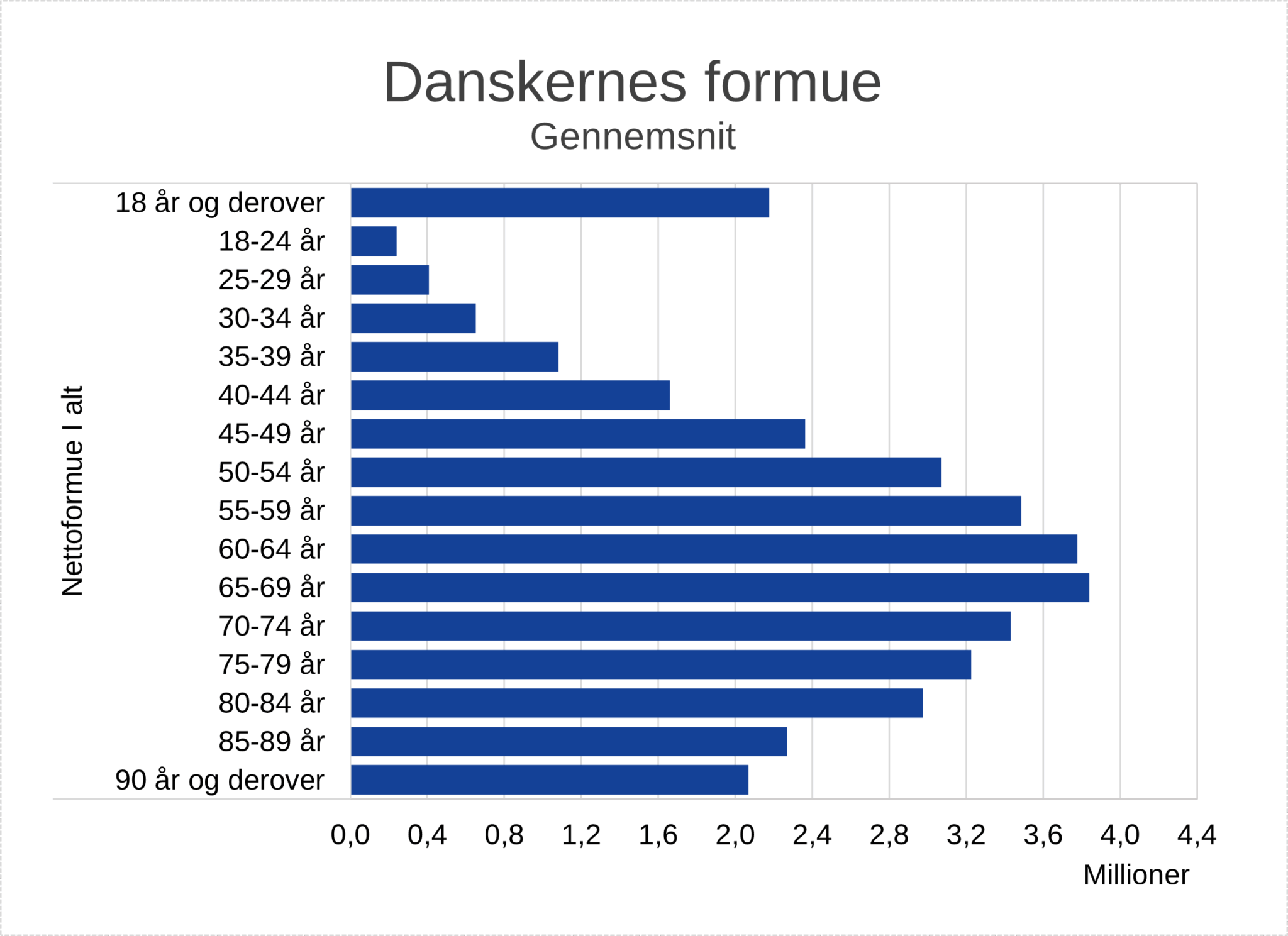 Ved udgangen af 2024 havde danskerne i gennemsnit en nettoformue på 2,18 mio. kr. – en stigning på 9,3 % fra året før. Medianen lå på 801.000 kr., hvilket giver et mere realistisk billede formuen for en almindelig dansker. Stigningen skyldes især højere boligpriser, pensionsopsparing og gode afkast på aktiemarkedet.