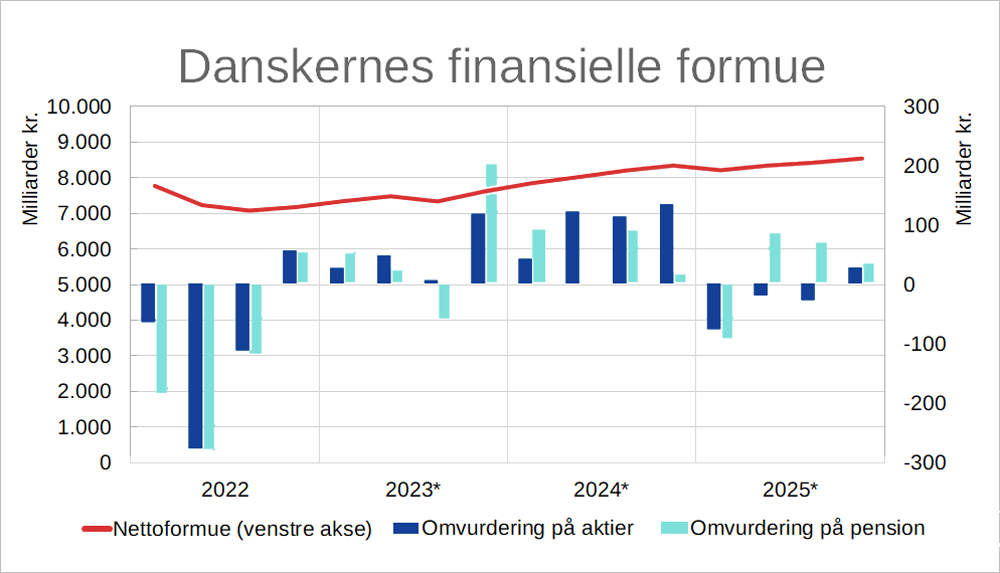 Ved udgangen af 2025 udgjorde husholdningernes finansielle nettoformue 8.519 mia. kr. Det er 193 mia. kr. mere end året før. Ifølge Danmarks Statistik skyldes stigningen især at aktie- og pensionsformuer steg i værdi.
