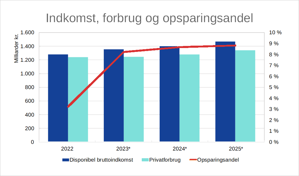 Tallene viser også, at lønstigningerne har været så store, at ikke alle pengene er blevet omsat i forbrug. Opsparingskvoten steg med 0,2 procentpoint i 2025. Det viser, at mange bevidst vælger at lægge en større del af indkomsten til side – også selv om privatøkonomien overordnet set har det godt.